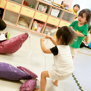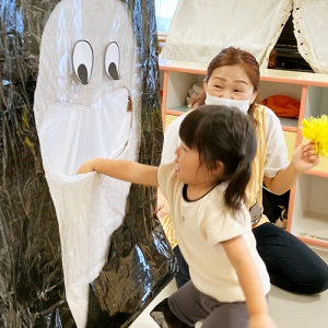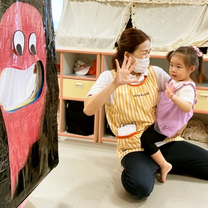 お口にボールを入れたらばけたくんの色が変わったよ!