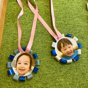 お部屋の中はお友だちの写真入りの旗が飾られています。